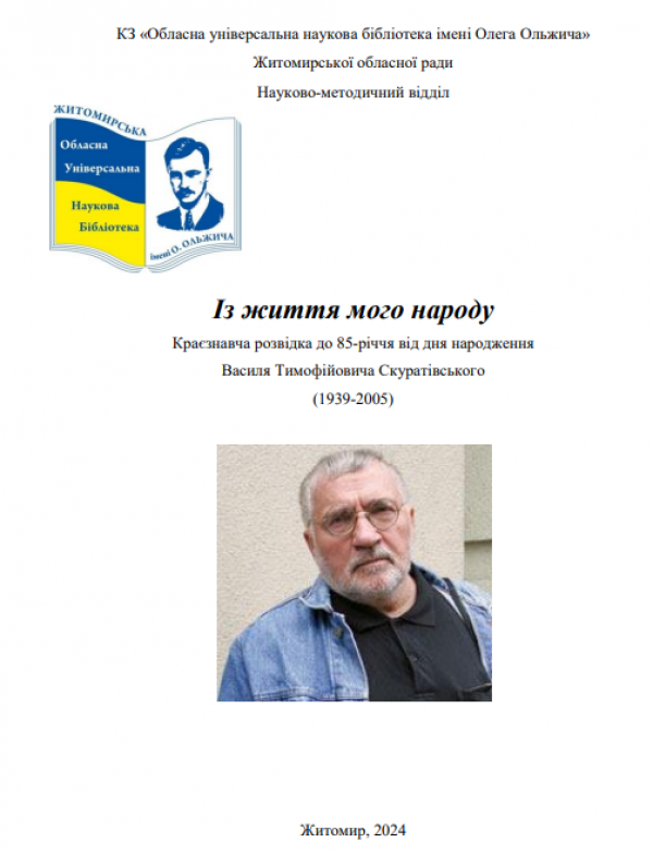 Із життя мого народу: краєзнавча розвідка до 85-річчя від дня народження Василя Тимофійовича Скуратівського / КЗ «Житомирська обласна універсальна наукова бібліотека ім О. Ольжича» Житомирської обласної ради ; уклад. З. Димарчук, ред. Г. Врублевська. – Житомир, 2024. – 14 с.