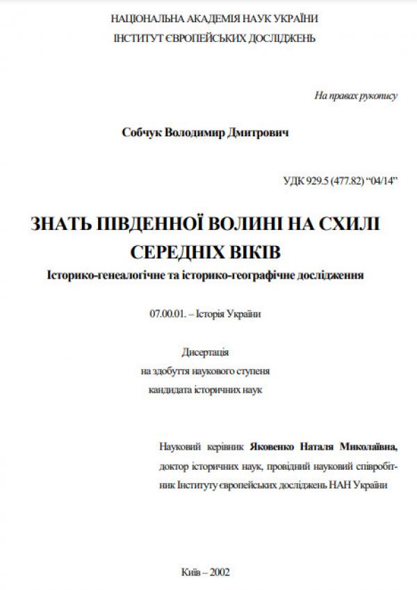 Собчук В. Д. Знать Південної Волині на схилі середніх віків : історико-генеалогічне та історико-географічне дослідження