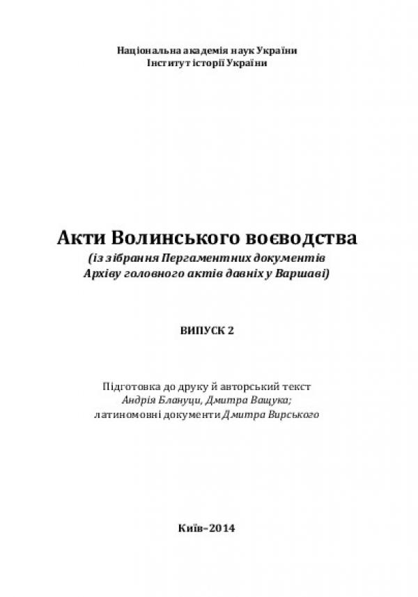 Акти Волинського воєводства (із зібрання Пергаментних документів Архіву головного актів давніх у Варшаві). Вип. 2 / підгот. А. Блануца, Д. Ващук; лат. док. Д. Вирського. — Київ : Інститут історії України НАН України, 2014. — 127 с.
