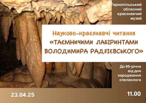 П’ятниця, 23 травня об 11:00 в експозиційному відділі природи Тернопільського обласного краєзнавчого музею відбудеться захід присячений 95-річчю від дня народження спелеолога Володимира Олександровича Радзієвського.
