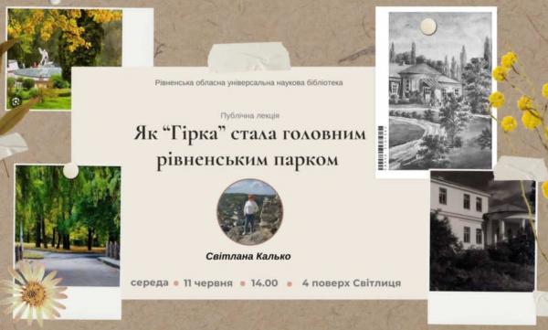 11 червня о 14:00 в приміщенні Рівненської обласної універсальної наукової бібліотеки відбудеться публічна лекція, присвячена унікальній зеленій пам’ятці Рівного – парку імені Тараса Шевченка, що колись був князівською резиденцією. Спікер заходу – відома рівненська журналістка та краєзнавиця Світлана Калько.