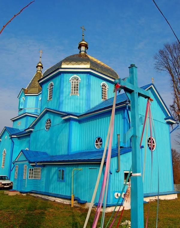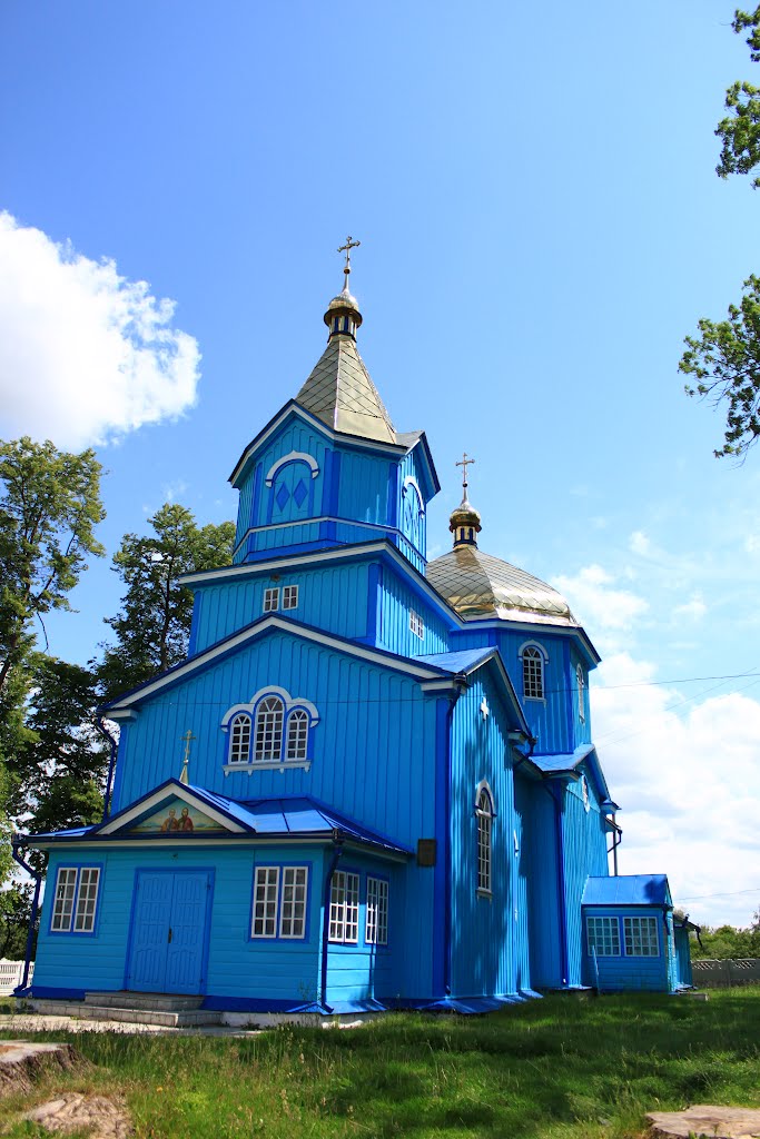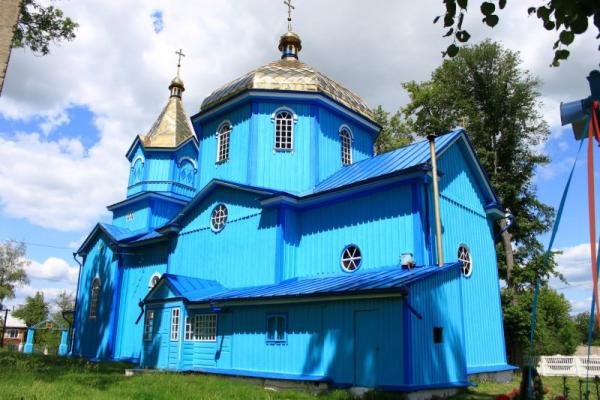 Дерев’яний, тризрубний, одноверхий храм з рівновисокими зрубами і прибудованою дзвіницею. Розпланувальне рішення складається з квадратного в плані центрального зрубу, а з також прямокутних бабинця та вівтарної частини. Нава має доволі високий надбудований восьмигранний барабан з віконними отворами на усіх восьми гранях, що створює сприятливе природне освітлення всередині храму. У внутрішньому просторі перехід від четверика до восьмерика здійснюється завдяки трикутним «вітрилам» у внутрішніх кутах. Головна баня має восьмигранну грушоподібну форму і завершується невеликою декоративною маківкою. Класицистичний мотив простежується у використанні шести трикутних фронтонів по зовнішньому периметру храму. Доволі великі віконні отвори мають півциркульне завершення з надвіконними сандриками та підвіконними карнизами. Використано також круглі вікна для освітлення центрального зрубу і абсиди. Зовнішні стінові поверхні опоряджено вертикальною шалівкою з нащільниками. Два нижніх яруси триярусної дзвіниці мають прямокутні плани, верхній ярус зі дзвонами на плані рівнобічного восьмигранника. Завершується дзвіниця восьмигранним наметовим верхом з трикутними фронтонами. Покрівля головної бані та шатра дзвіниці виконані з жерсті жовтого кольору (так званий «златосвєт»). Інші частини покрівлі храму з жерсті, фарбованої в темно-синій колір. Храм має два притвори: зі сторони головного входу та на південній стіні нави. До південної стіни абсиди прибудовано приміщення різниці. Колористична гама на момент обстеження (2016) – голубі стіни, білі та темно-сині деталі, жовта покрівля верхів, темно-синя покрівля дахів.