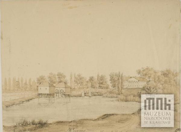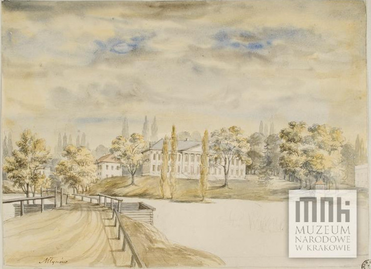 Достеменно невідомо коли Млинів став власністю Ходкевичів – роду, який походив з Великого князівства Литовського. Припускають, що це сталося в 1560-х роках і пов’язано з віленським каштеляном і великим гетьманом литовським Григорієм Ходкевичем. Містечко начебто було посагом його дружини Катерини Вишневецької. Наприкінці XVIII століття багатства Ходкевичів були досить великими. Вони володіли багатьма селами і містечками. У 1789 р. власники Млинова добилися влаштування тут двох щорічних ярмарків. Разом з тим господарі містечка вирішують саме тут збудувати свою резиденцію. Ініціаторами будівництва була Людвіка Ходкевич зі своїм чоловіком Миколаєм. Будівництво розпочалося у 1790 р. Архітектором проєкту був варшавський Кароль Шютц. Наприкінці нагляд за роботами вів інший архітектор – Ян Слонєвський. Комплекс усіх споруд був чимось справді цікавим. Так посеред розпланованого парку будувалося кілька споруд. Серед них головний корпус двоповерхового палацу з 6 колонами на головному вході. Бічний флігель був дещо меншим, його головний вхід оздоблювали 4 колони. До колони з обох боків і по центру підходили під’їзні доріжки. На фронтоні портика, який завершував колони – багата ліпнина з ініціалами фундаторки – L.C. В овалах композиції – герб Ходкевичів. На фасадах у проміжках між вікнами виділялися пілястри. Всередині палац був влаштований в системі анфіляди. За часів фундаторки будівля отримала багатий декор. Стіни та стеля були покриті розписами на різні сюжети. На стелі – ліпнина з рослинними мотивами і розписами на гротескну тематику. У деяких кімнатах містилися мармурові і муровані каміни. Деякі мали ліпні ніші у вигляді мушлі, які скоріше були творами мистецтва. Нерозписані стіни прикрашалися тканиною чи іншим видом обшивки у тональності всього приміщення. Над цим спеціально працювали художники Вінцентій Боркевич та Мьодушевський. Права частина палацу була репрезентаційною. Вона більше декорована і краще розписана. Тут була більярдна зала, передпокій з тосканськими мотивами у декорі, парадна зала з вишуканими меблями і римськими старожитностями у розписах. У палаці були різні порцелянові вироби, старовинні годинники, статуетки, які прикрашали різні кімнати. Користувалися Ходкевичі окремою мозаїковою залою. І таких різноманітних кімнат у палаці ще було дуже багато. Їх детальний опис зберігся і зараз, перебуває в архіві у Польщі. Цінні колекції в млинівській резиденції Ходкевичів – бібліотека, архів, картини та інші твори мистецтва. В малярській збірці були роботи відомих авторів, родинні портрети. Протягом ХІХ століття ці колекції тільки поповнювалися. Сам палац завершили будувати в першій половині ХІХ століття (хоча деякі частини добудовувалися значно пізніше) і мав він риси класицизму за модою тих часів. З описів палацу відомо також і про паркові павільйони, які знаходилися на території палацо-паркового ансамблю. Споруда, камера-обскура називали ящик з отвором для проходження світла. На протилежній стінці ящика отримувалося зображення. Це був простий пристрій, прототип майбутніх фотоапаратів. З опису цього критого ґонтом павільйону стає зрозуміло, що і в волинській резиденції Ходкевичів камера-обскура використовувалася за призначенням. У камері була дубова підлога, складена з квадратних тафель. Тут стояло кілька