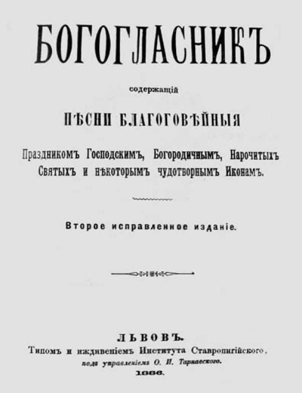 Богогласник [з нотами] : пісни благоговіиныя праздником господьским, богородичным и нарочитых святых…, к сим же нікоторым чудотворным иконам служащыя, таже различныя покаянныя и умилителныя содержащ. – Почаїв: Друкарня Успенського монастиря, 1790. – [292] арк.; 4. – Режим доступу: http://irbis-nbuv.gov.ua/dlib/item/0000002. – Назва з екрана.