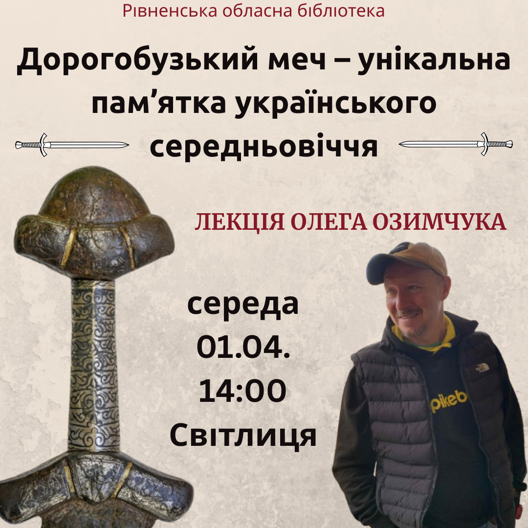 Запрошуємо 1 квітня о 14:00 в Рівненській обласній бібліотеці на лекцію доктора філософії Олега Озимчука «Дорогобузький меч – унікальна пам’ятка українського середньовіччя».